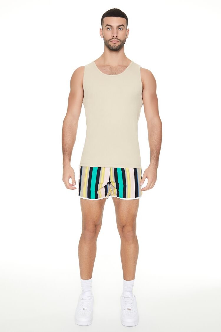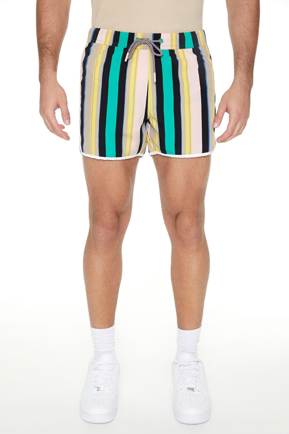 Details A pair of woven swim trunks featuring an allover striped pattern, short 4′ inseam, drawstring waist, contrasting trim, and dolphin hem.Content + Care – Shell: 87% nylon, 13% spandex – Lining: 100% polyester – Machine wash cold Size + Fit – Model is 6’2.5′ and wearing a Medium – Inseam: 4′