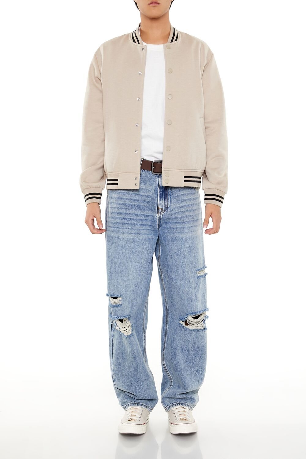 Details A fleece bomber jacket featuring varsity-striped trim, long sleeves, snap-button front closures, and slant front pockets.Content + Care – 100% polyester – Machine wash cold Size + Fit – Model is 6’1′ and wearing a Medium